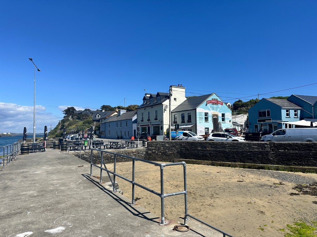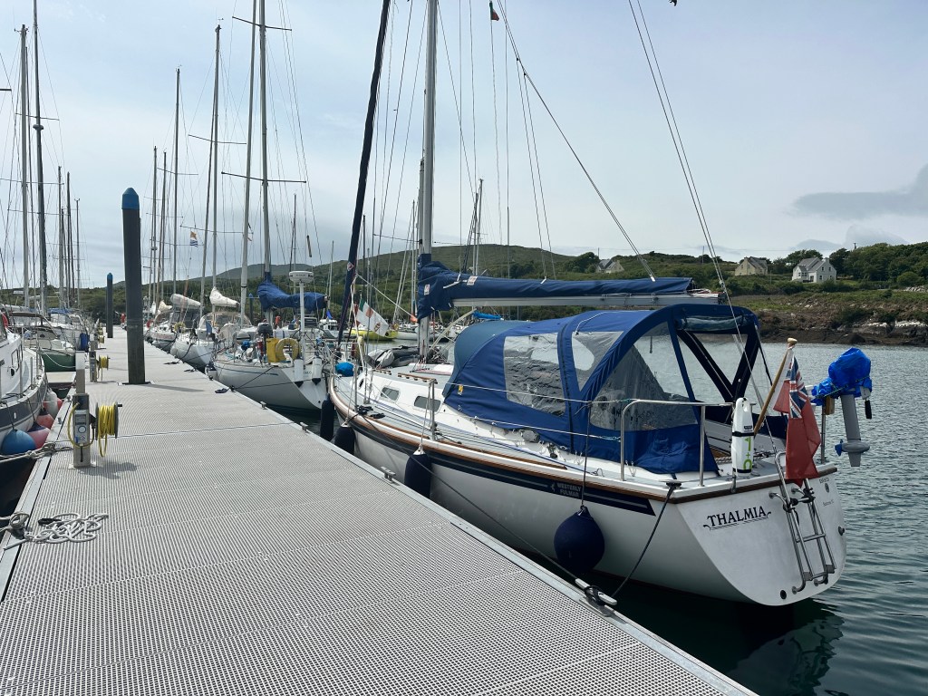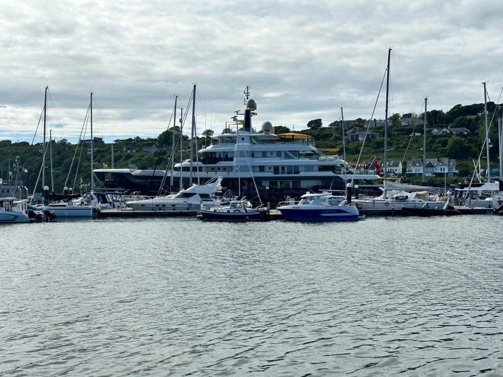 In Kinsale I used a different marina, partly because the Kinsale Yacht Club was full with a fleet of big yachts from the Royal Yacht Squadron. Castlepark Marina was so friendly though and the walks to James Fort gave a wonderful view of the harbour. I had a very expensive neighbour as you will see and I was visited by two men with heavy boots from the Border Force. A deep dive into all my lockers did not find any drugs or immigrants! My luxury neighbour, Scout, (named after the owner’s dog who has a statue perched on the bow – the dog that is!) was bought for $84m from the Heineken family and has 3 bars, jacuzzi etc etc. Thalmia has a small drinks cupboard and access via a boarding ladder to the sea!